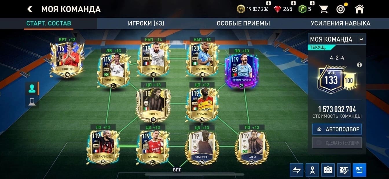 💰Золото: 2 633 822📗Fifa-point: 0🛑605💪 Игроки : 28